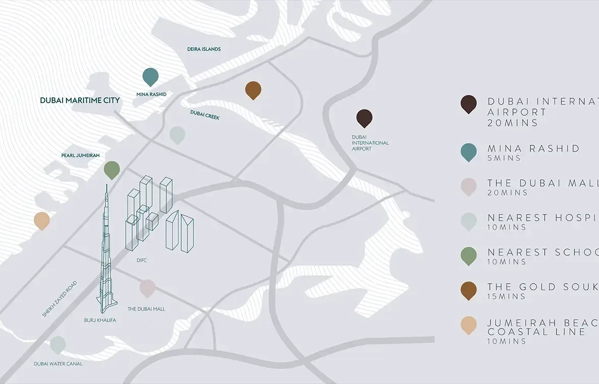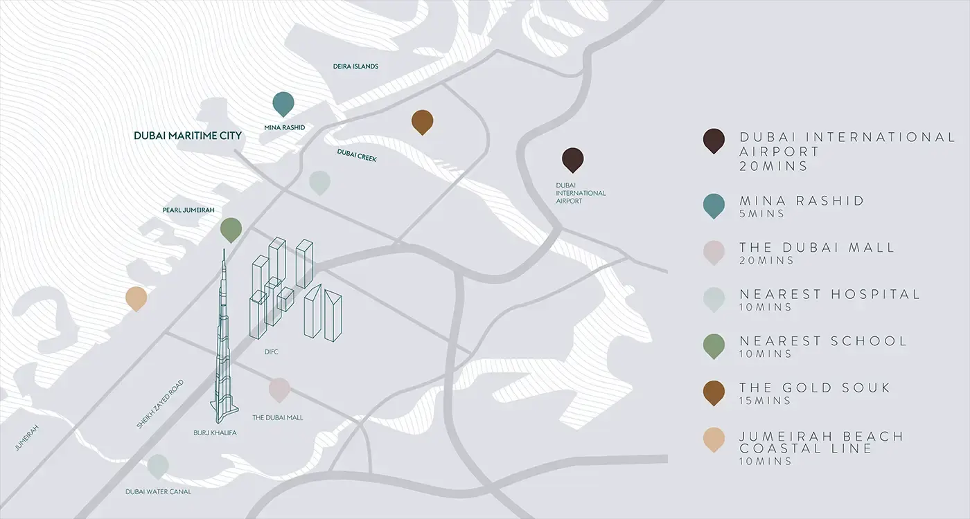 - Positioned at the heart of Dubai Maritime City, enjoys a rare seafront location with seamless access to the city’s heritage zones and modern infrastructure.