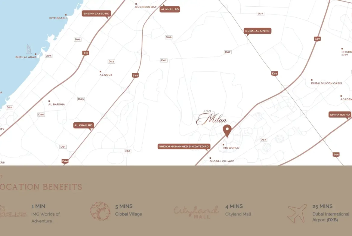 Within City of Arabia, the façade embraces the premium lifestyle elements that reside in exceptional living. As a site which overlooks Sheikh Mohammed Bin Zayed Road and resides near Sheikh Zayed Bin Hamdan Street, presents its residents outstanding access to Dubai’s critical landmarks. Both IMG Worlds of Adventure and Global Village together with Dubai International Airport and Al Maktoum International Airport stay within easy reach. Its excellent location allows resident access to all areas of Dubai including Business Bay, Dubai Silicon Oasis and the spectacular Palm Jumeirah district, thus maintaining their prime position between opportunities and excitement. The prime location allows residents to enjoy convenience with opportunities in a city where time passes at an unceasing pace.