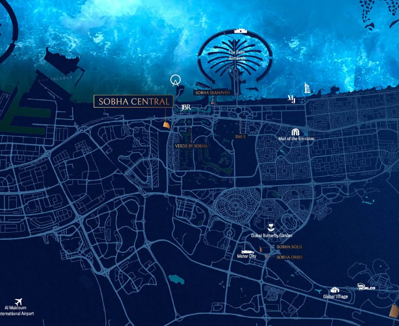 Sobha Central is a high-rise residential development by Sobha Realty, located along Sheikh Zayed Road. Comprising six interconnected towers rising up to 90 floors, this upcoming project offers breathtaking views of the sea, as well as Dubai Marina, Palm Jumeirah, and Bluewaters Island. The complex includes two dedicated lanes for smooth entry and exit, along with a rare fly-out bridge—providing direct and convenient access to key destinations.